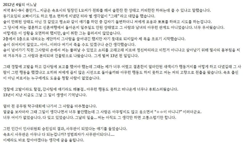 20일 속초시청 노동조합 자유게시판에는 '성범죄자가 사무관이 됐다'는 제목의 폭로 글이 게시됐다. 자신을 현직 공무원이자 과거 사건의 피해자라고 밝힌 A씨는 13년 전 당시 팀장이었던 L씨로부터 당한 끔찍한 성추행 미수 사건을 가감 없이 공개했다.