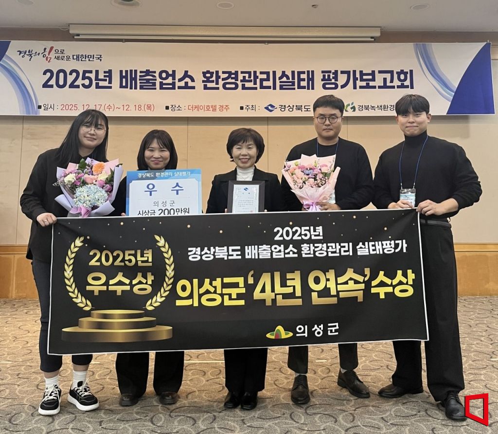 경북 의성군이 환경관리 행정의 안정성과 실효성을 동시에 입증했다. 의성군은 지난 17일 열린 '2025년 경상북도 배출업소 환경관리 실태평가'에서 2그룹 1위를 차지하며 도 전체 우수상을 받았다고 밝혔다. 이로써 의성군은 해당 평가에서 4년 연속 수상이라는 성과를 이어가게 됐다.