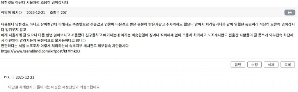 특히 B씨는 조직적 은폐를 정당화하기 위해 타 지자체의 사례까지 들며 "서울은 징계나 직위해제 없이 조용히 처리하고, 노조 게시판도 전출자가 글을 못 쓰게 외부 접속을 차단해 폭로를 원천 봉쇄한다"며 속초시 노조 게시판 역시 외부 접속을 차단할 것을 촉구했다.