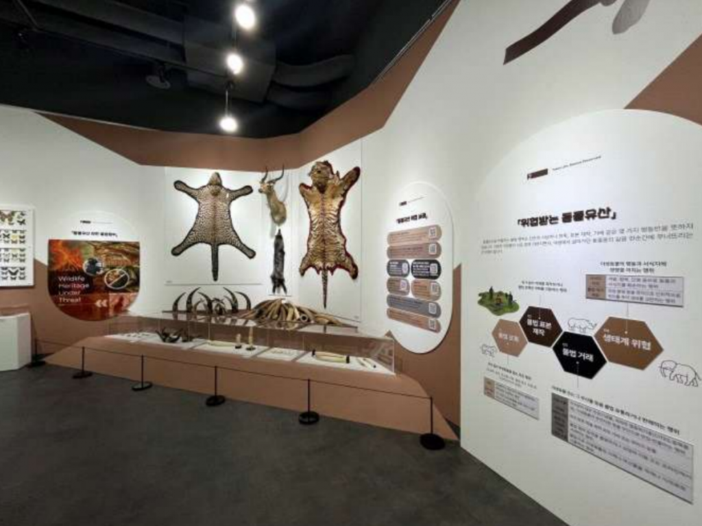 전시는 생명에서 출발해 경고와 다짐으로 이어진다. 도입부에서 조류와 포유류의 생태를 살핀 관람객은 곧이어 인간의 욕심이 할퀴고 간 흔적과 마주한다. 호랑이와 표범 가죽, 물소 뿔 등 위협받는 유산들의 처참한 모습은 보호의 절실함을 역설한다. 마지막은 관람객이 직접 '동물유산 지킴이'가 되겠노라 약속하며 메시지를 남기는 참여 공간으로 꾸며졌다.