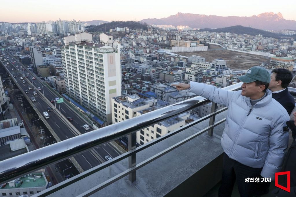 오세훈 서울시장이 22일 서울 성북구 북부간선도로 하월곡JCT 인근에서 강북횡단 지하고속도로 사업현장을 점검하고 있다.