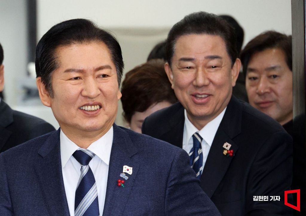 정청래 더불어민주당 대표와 김병기 원내대표가 22일 국회에서 열린 최고위원회의에 참석하고 있다.