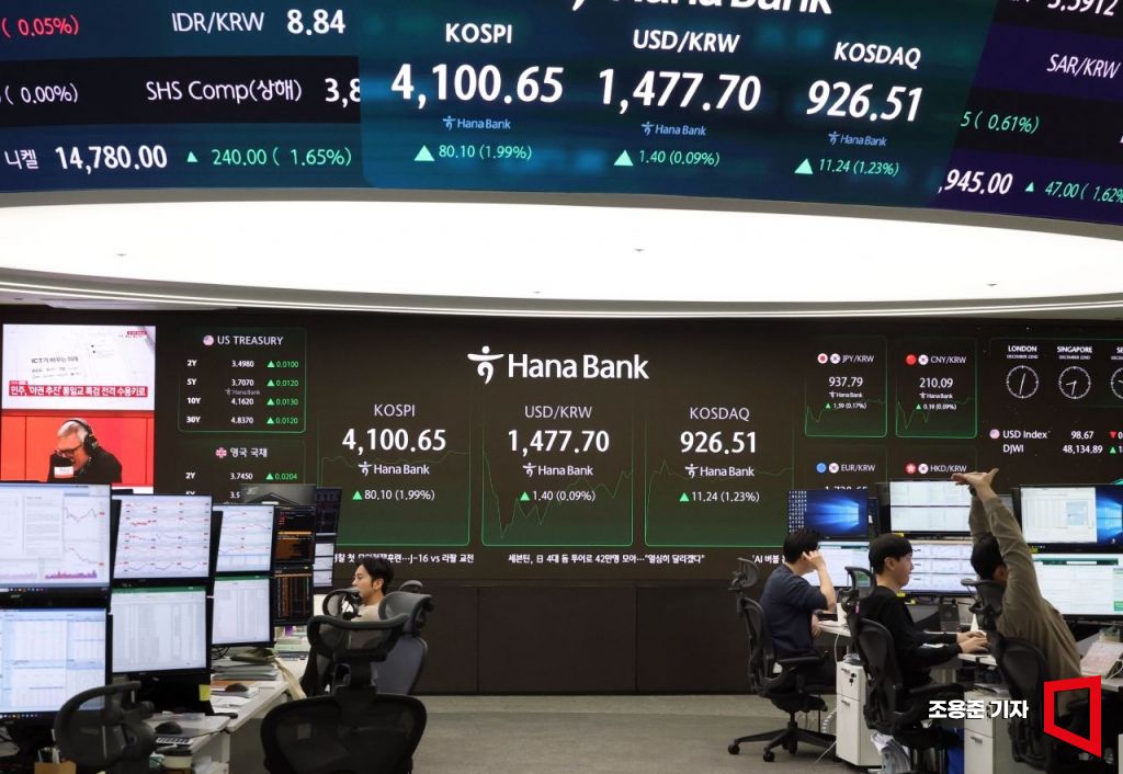 코스피가 장중 4100선을 회복한 가운데 22일 서울 중구 하나은행 딜링룸 현황판에 코스피, 원/달러 환율, 코스닥 등이 표시돼 있다. 이날 오전 9시 3분 현재 코스피는 전장보다 69.15포인트(1.72%) 오른 4,089.70에 거래를 시작해 상승폭을 넓히고 있다. 2025.12.22 조용준 기자