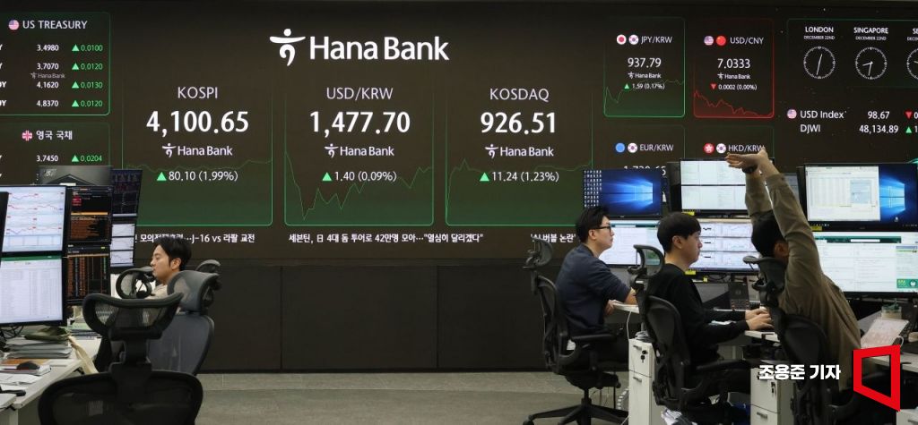 코스피가 장중 4100선을 회복한 가운데 22일 서울 중구 하나은행 딜링룸 현황판에 코스피, 원/달러 환율, 코스닥 등이 표시돼 있다. 이날 오전 9시 3분 현재 코스피는 전장보다 69.15포인트(1.72%) 오른 4,089.70에 거래를 시작해 상승폭을 넓히고 있다.