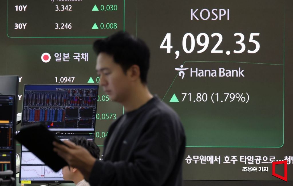22일 서울 중구 하나은행 딜링룸 현황판에 코스피, 원/달러 환율, 코스닥 등이 표시돼 있다. 이날 오전 9시 3분 현재 코스피는 전장보다 69.15포인트(1.72%) 오른 4,089.70에 거래를 시작해 4100선을 회복하는 등 상승폭을 넓히고 있다.