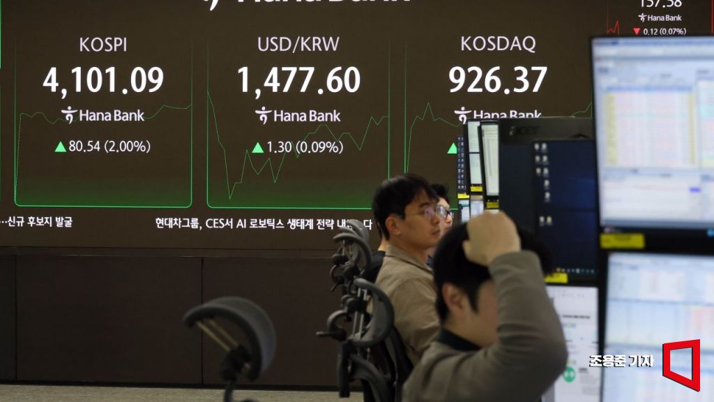 코스피가 장중 4100선을 회복한 가운데 22일 서울 중구 하나은행 딜링룸 현황판에 코스피, 원/달러 환율, 코스닥 등이 표시돼 있다. 이날 오전 9시 3분 현재 코스피는 전장보다 69.15포인트(1.72%) 오른 4,089.70에 거래를 시작해 상승폭을 넓히고 있다.