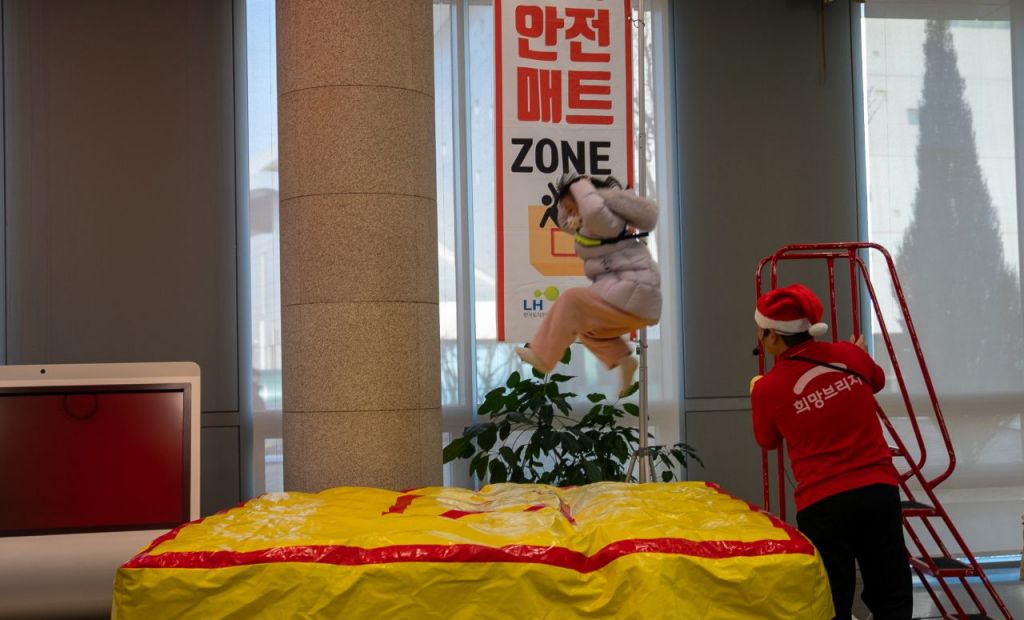 희망브리지와 LH한국토지주택공사가 진행하는 재난안전 체험교육에 참여한 아동이 안전매트 사용 실습을 하고 있다. 희망브리지