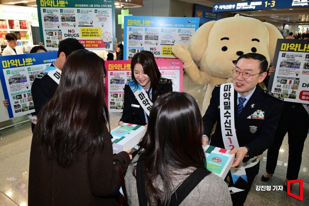 이명구 관세청장과 관세청 마약근절 홍보대사 김승혜를 비롯한 인천공항세관 직원들이 22일 오전 인천국제공항 제1여객터미널에서 '마약밀수 근절'을 위한 캠페인으로 공항 이용객에게 선물과 안내문을 전달하고 있다. 관세청은 마약밀수 근절을 위해 '마약 나뽀(마약으로부터 나를 지키는 4가지 방법' 캠페인을 실시하며 △해외여행 시 대마 제품등 마약류 구매 안하기 △공짜 여행을 미끼로 한 마약류 대리 반입 유혹 떨치기 △인터넷 사이트를 통한 마약류 해외직구 안하기 △텔레그램 등 SNS를 악용한 마약거래 안하기 등을 권고했다.