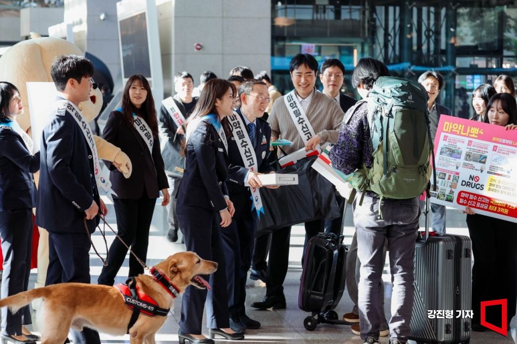 22일 인천국제공항 1터미널에서 이명구 관세청장과 관세청 마약근절 홍보대사 개그우먼 김승혜 씨, 마약 탐지견 캐릭터 ‘마타’, 마약 탐지견 ‘마를리’ 등이 마약밀수 근절을 위한 현장 행진 캠페인 ‘마약 나뽀(4)’를 벌이고 있다. ‘마약 나뽀(4)’는 마약으로부터 나를 지키는 4가지 방법으로 ‘해외여행시 대마제품 등 마약류 구매 안하기’ ‘공짜여행을 미끼로 한 마약류 대리 반입 유혹 떨치기’ ‘인터넷 사이트를 통한 마약류 해외직구 안하기’ ‘텔레그램 등 SNS의 익명성을 악용한 마약거래 안하기’를 말한다.
