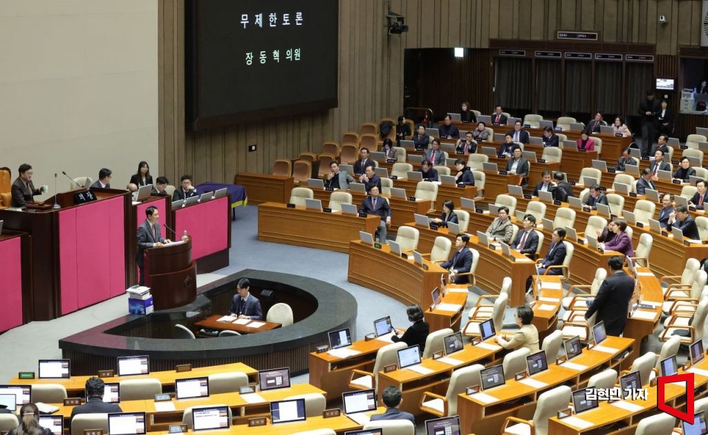 장동혁 국민의힘 대표가 22일 국회에서 열린 12월 임시국회 본회의에서 12·3 윤석열 비상계엄 등에 대한 전담재판부 설치 및 제보자 보호 등에 관한 특별법에 대한 무제한 토론을 하고 있다.