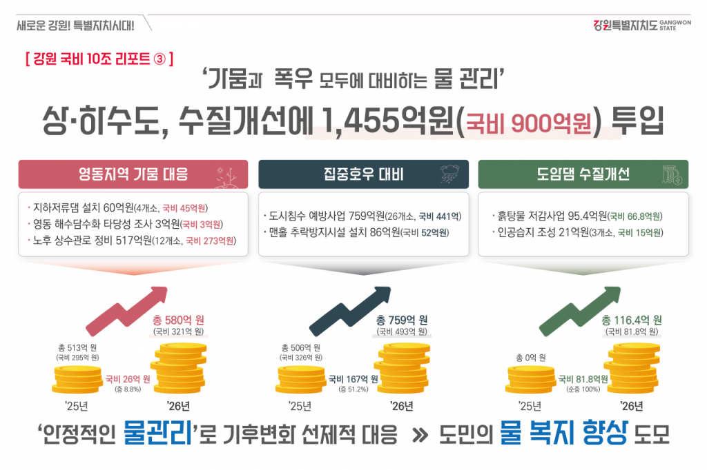 강원특별자치도(도지사 김진태)는 내년도에 1455억원을 투입하여 가뭄 및 집중호우 등 물로 인한 기후변화와 자연재해로부터 안전한 강원자치도를 만들어 나갈 계획을 22일 밝혔다.