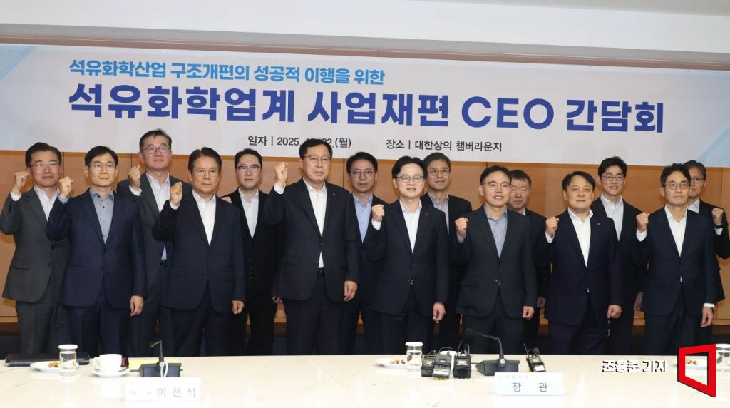 김정관 산업통상부 장관(앞줄 가운데)을 비롯한 참석자들이 22일 서울 중구 대한상공회의소 챔버라운지에서 열린 석유화학산업 구조개편의 성공적 이행을 위한 '석유화학업계 사업재편 CEO 간담회'에서 기념촬영을 하고 있다.