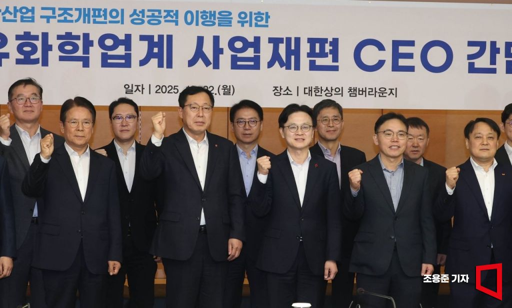 김정관 산업통상부 장관(앞줄 가운데)을 비롯한 참석자들이 22일 서울 중구 대한상공회의소 챔버라운지에서 열린 석유화학산업 구조개편의 성공적 이행을 위한 '석유화학업계 사업재편 CEO 간담회'에서 기념촬영을 하고 있다.
