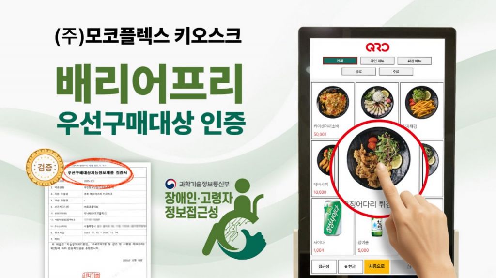 프랜차이즈 통합 관리 솔루션 '큐로(QRO) 비즈' 운영사 모코플렉스는 한국지능정보사회진흥원(NIA)의 우선구매대상 지능정보 제품 검증서를 취득, 서비스 중인 큐로 배리어프리 키오스크 인증을 마쳤다고 23일 밝혔다.
