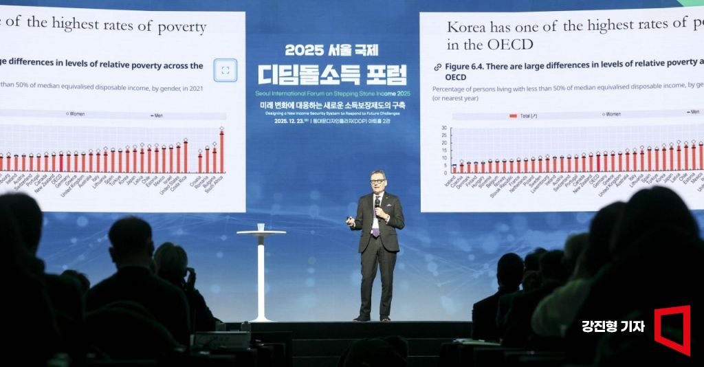 2024 노벨 경제학상을 수상한 제임스 로빈슨 시카고대 교수가 23일 서울 중구 동대문디자인플라자에서 열린 '2025 서울 국제 디딤돌소득 포럼'에 참석해 '경제성장과 사회적 분배, 복지 : 정부의 역할'이란 주제로 발표 하고 있다.