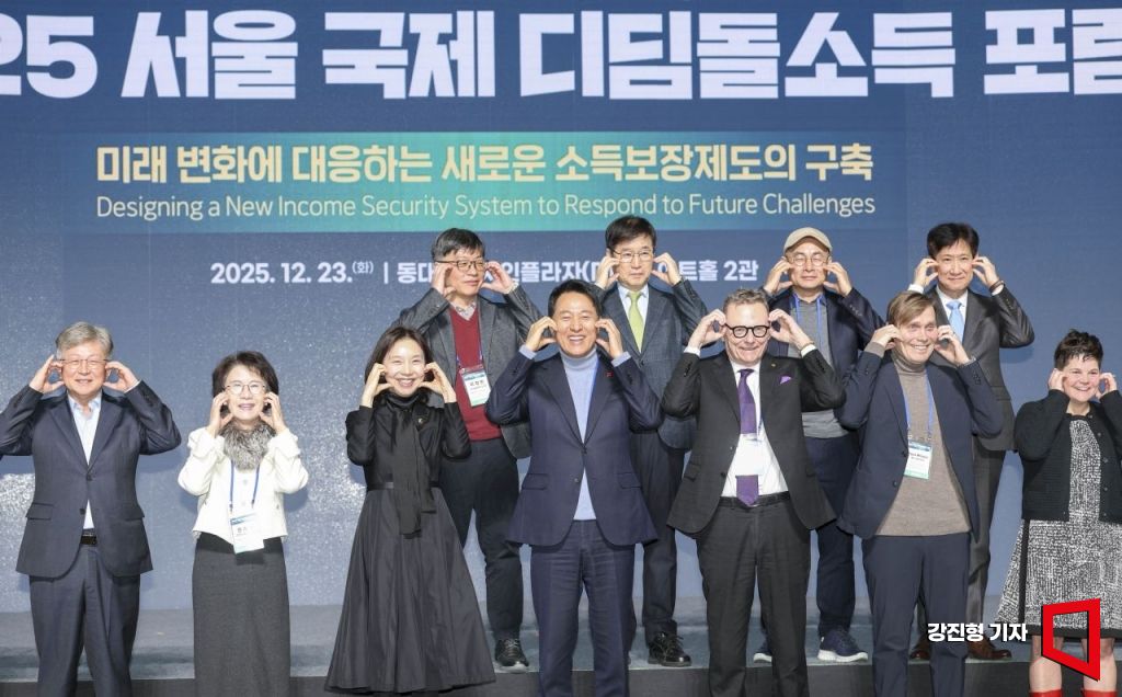 오세훈 서울시장을 비롯한 연사 및 주요내빈들이 23일 서울 중구 동대문디자인플라자에서 열린 '2025 서울 국제 디딤돌소득 포럼'에서 기념촬영 하고 있다.