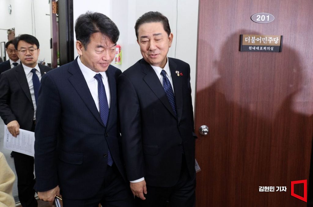 김병기 더불어민주당 원내대표와 문진석 원내운영수석부내가 23일 국회에서 열린 원내대책회의에 참석하고 있다.