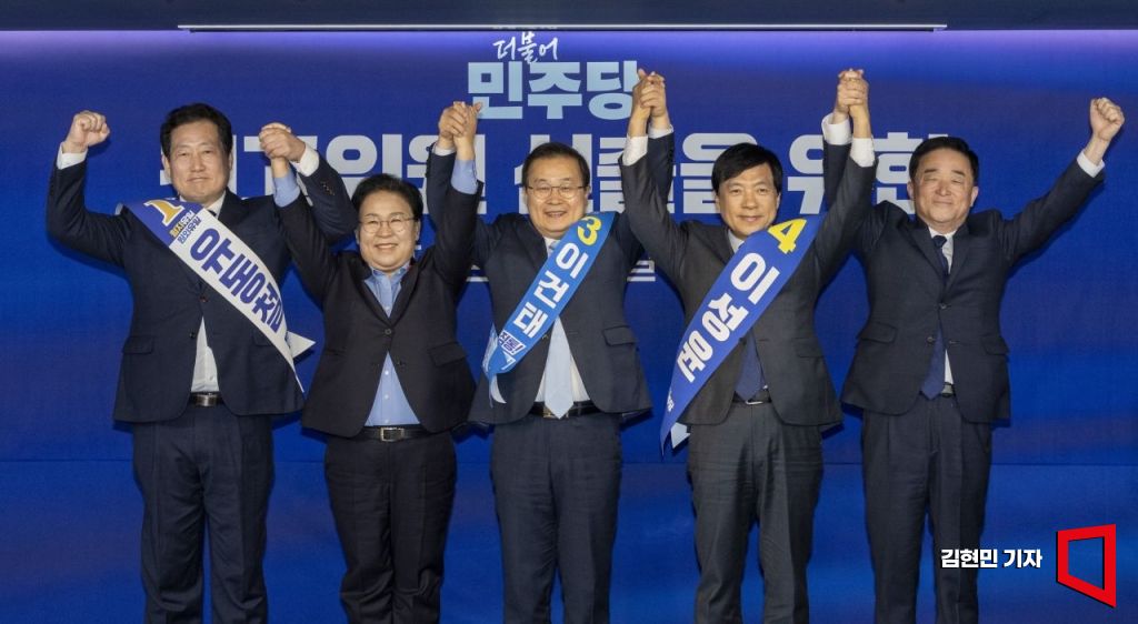 더불어민주당 최고위원 선출을 위한 1차 합동연설회가 23일 서울 영등포구 여의도 중앙당사에서 열렸다. 유동철(왼쭉부터), 문정복, 이건태, 이성윤, 강득구 최고위원 후보들이 기념촬영을 하고 있다.