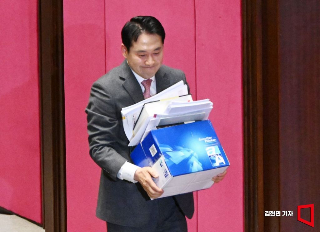 장동혁 국민의힘 대표가 23일 국회에서 열린 본회의에서 내란전담재판부 설치법에 대한 24시간의 무제한 토론을 마친 뒤 발언대에서 내려오고 있다. 사상 처음 제1야당 대표로 나선 장 대표의 무제한 토론은 역대 최장인 24시간을 기록했다.