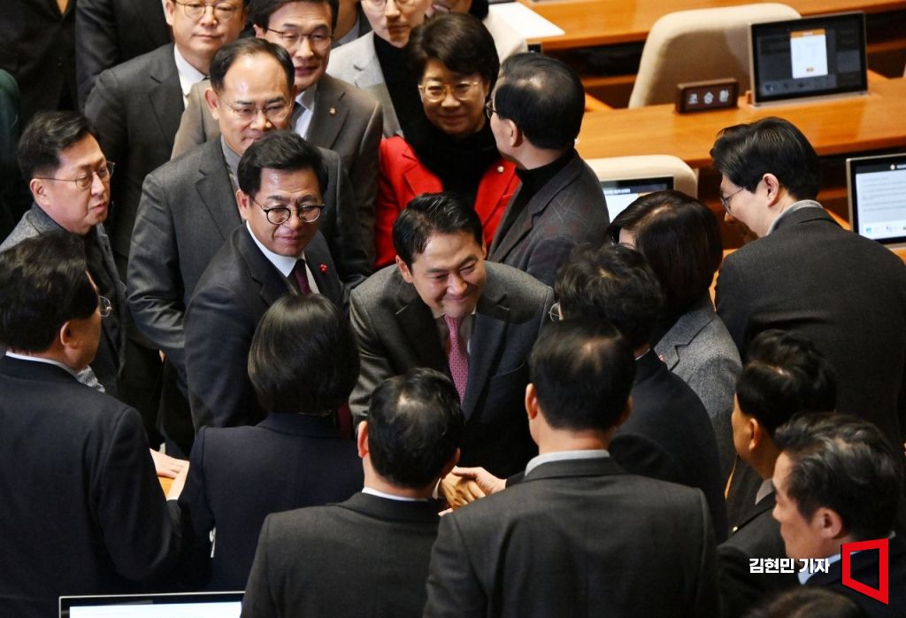 장동혁 국민의힘 대표가 23일 국회에서 열린 본회의에서 내란전담재판부 설치법에 대한 24시간의 무제한 토론(필리버스터)을 마친 뒤 야당 의원들과 인사하고 있다. 사상 처음 제1야당 대표로 나선 장 대표의 필리버스터는 역대 최장인 24시간을 기록했다.