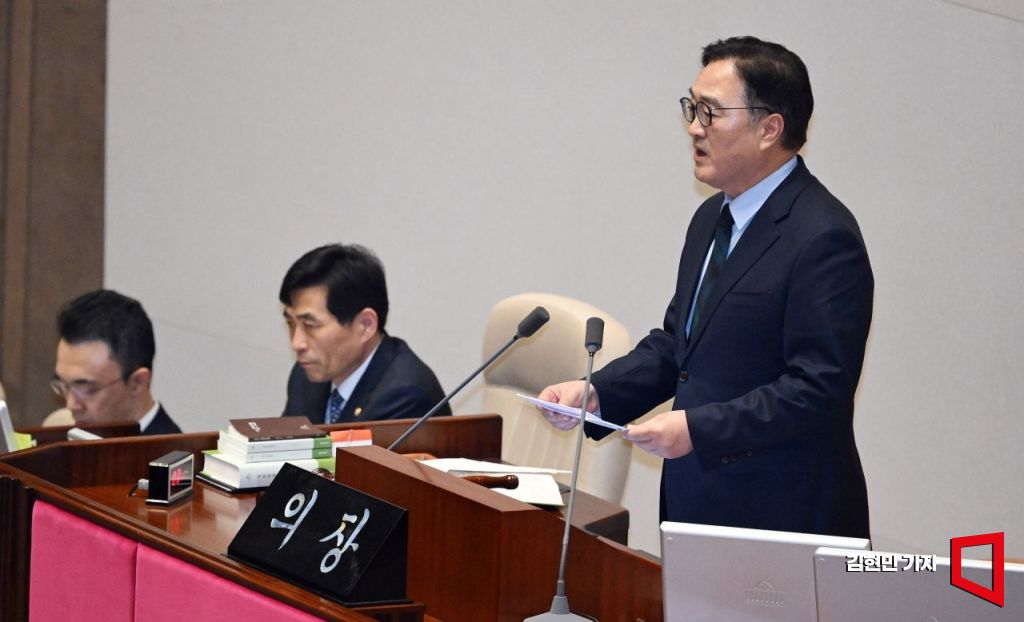 우원식 국회의장이 23일 국회에서 열린 본회의에서 이학영 부의장과 12시간 맞교대 무제한 토론(필리버스터) 사회로 인한 피로 누적을 호소하며 사회 교대를 거부한 주호영 부의장에 대한 유감을 표하고 있다.