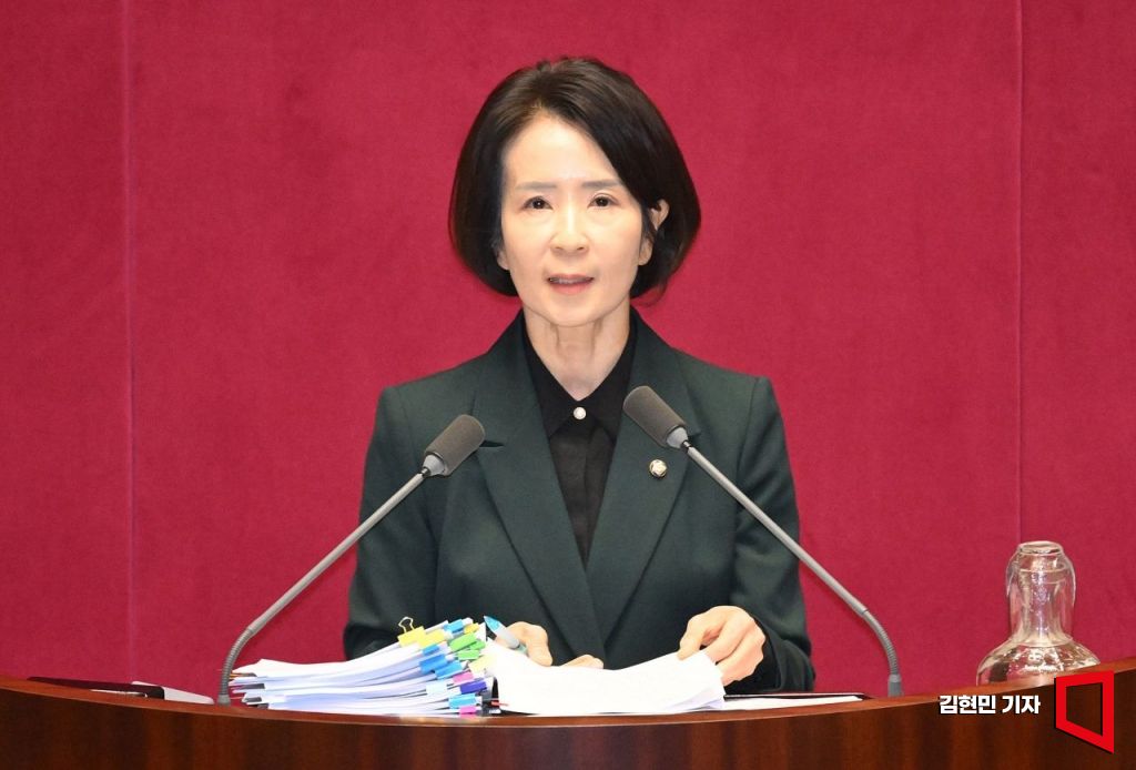 최수진 국민의힘 의원이 23일 국회에서 열린 본회의에 정보통신망 이용촉진 및 정보보호 등에 관한 법률 일부개정법률안(허위조작정보 근절법)이 상정되자 무제한 토론(필리버스터)을 시작하고 있다.