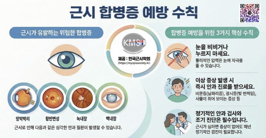 고도근시 환자를 위한 합병증 예방 수칙도 다뤄졌다. 고도근시는 단순 시력 문제를 넘어 실명 위험이 있는 망막박리 등 중대 질환의 주요 위험 인자이다. 눈을 비비거나 누르는 등 물리적 자극을 가하는 행동을 삼가야 합병증을 예방할 수 있다. 특히 날파리가 보이는 듯한 비문증 증상이 늘어나거나 빛이 번쩍이는 광시증, 시야 가려짐 및 흐려짐, 갑작스러운 시력 저하, 사물이 휘어 보이는 증상이 나타나면 즉시 안과 진료를 받아야 한다. 고도근시라면 특별한 증상이 없더라도 매년 정기적으로 망막, 시신경, 안압 검사 등 전문 장비를 활용한 검진을 받는 것이 합병증 관리의 핵심이다.