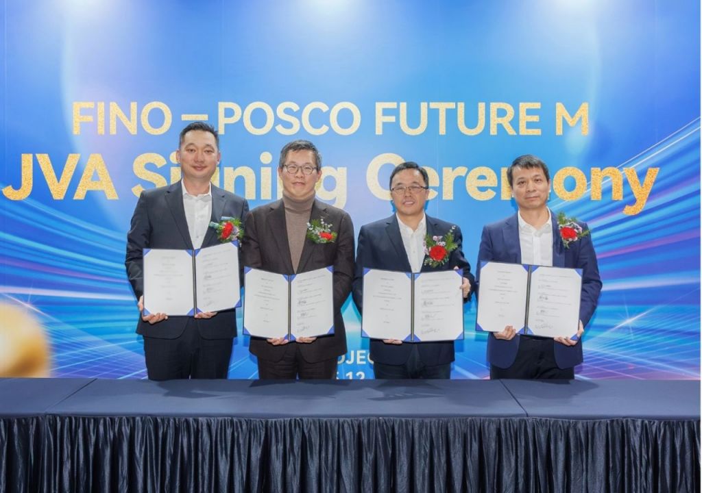 포스코퓨처엠이 CNGR 및 피노와 LFP 양극재 합작투자계약(JVA)을 23일 체결했다. 왼쪽부터 김동환 피노 대표, 윤태일 포스코퓨처엠 에너지소재마케팅본부장, 주종완(Zhu Zongyuan) CNGR 부총재, 따이주푸(Dai Zhufu) 씨앤피신소재테크놀로지 대표이사. 포스코퓨처엠