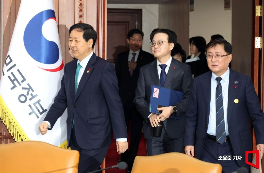 구윤철 경제부총리 겸 기획재정부 장관(왼쪽)을 비롯해 김정관 산업통상부 장관(가운데) 등 국무위원들이 24일 서울 종로구 정부서울청사에서 열린 경제관계장관회의 및 산업경쟁력강화 관계장관회의에 참석하고 있다.