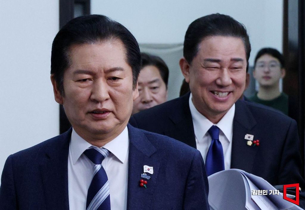 정청래 더불어민주당 대표와 김병기 원내대표가 24일 국회에서 열린 최고위원회의에 참석하고 있다.