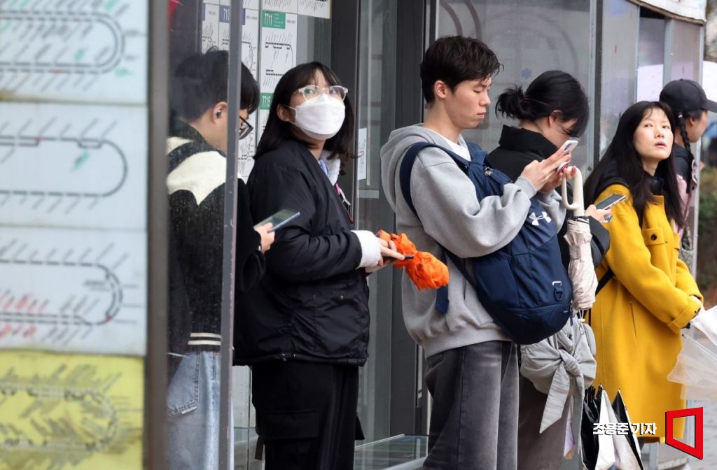 28일 서울 상암동의 한 버스정류장에는 출근길 시민들이 버스를 기다리고 있다. 조용준 기자
