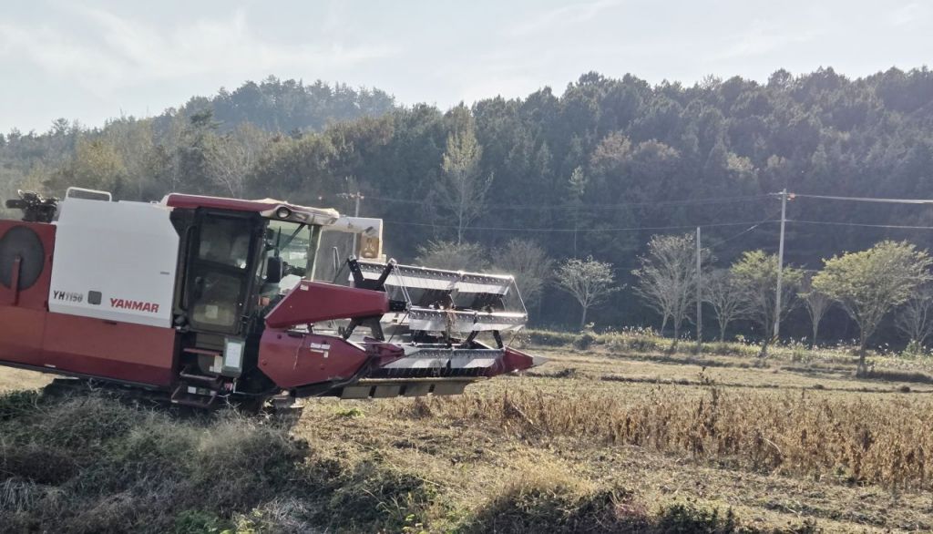 전남 강진군의 한 논에서 수확기를 맞은 콩 재배지에서 농기계가 작업을 진행하고 있다. 강진군 제공
