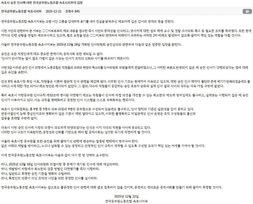전공노 속초시지부는 이번 사안을 '공정성과 신뢰의 위기'로 규정하고 △문제 인사에 대한 재심의 △다면평가 제도의 즉각적 시행 △일관되고 투명한 승진 기준 수립 △시민과 조직을 위한 공정한 인사 운영 원칙 확립 등을 요구했다. 속초시는 전공노 속초시지부로부터 입장을 전달받은 뒤 관련 내용에 대한 검토와 논의를 진행할 예정이다.