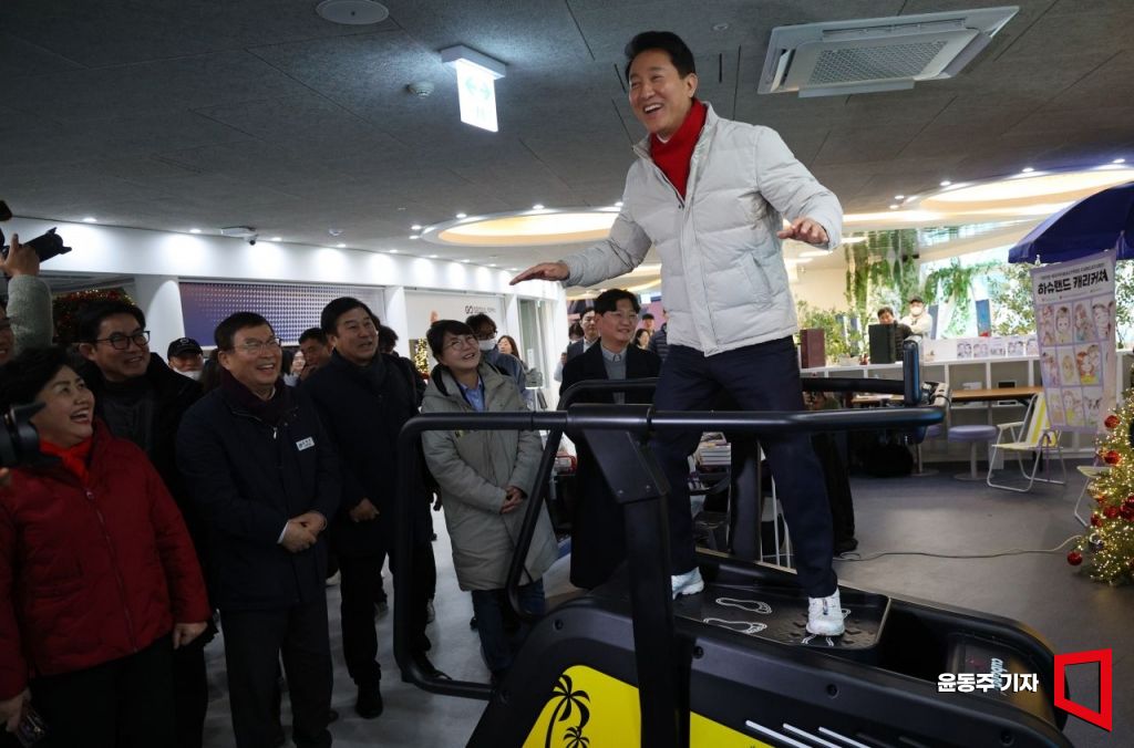 오세훈 서울시장이 24일 서울 광진구 뚝섬한강공원 자벌레 및 청담대교 하부 일원에서 열린 '2025 로맨틱 한강 크리스마스 마켓'을 방문, 인공 서핑을 즐기고 있다.