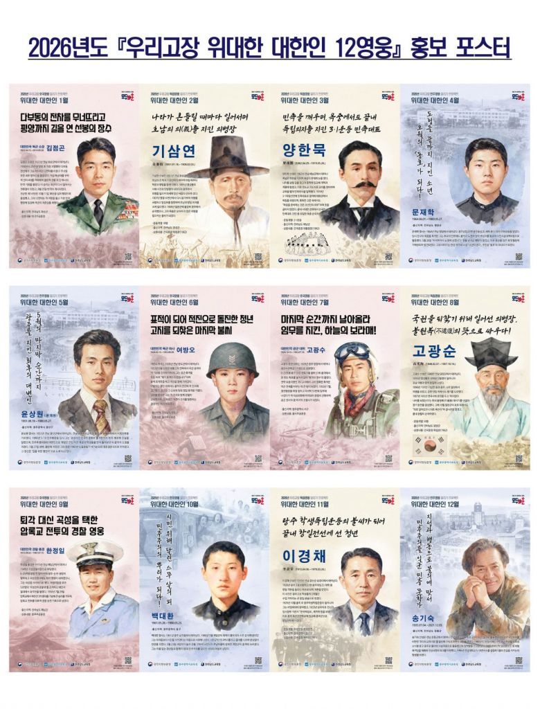 광주지방보훈청은 "이번 '우리고장 위대한 대한인 12영웅' 선정은 단순한 인물 소개를 넘어, 지역의 보훈 자산을 교육과 일상 속에서 살아 있는 역사로 확장하는 데 의미가 있다"며 "교육청·유관기관과 협력해 광주·전남 지역 학교를 중심으로 12영웅 계기교육을 추진하고, 지역 언론과 연계한 홍보를 통해 보훈 교육·홍보 활동을 이어갈 계획이다"고 말했다.