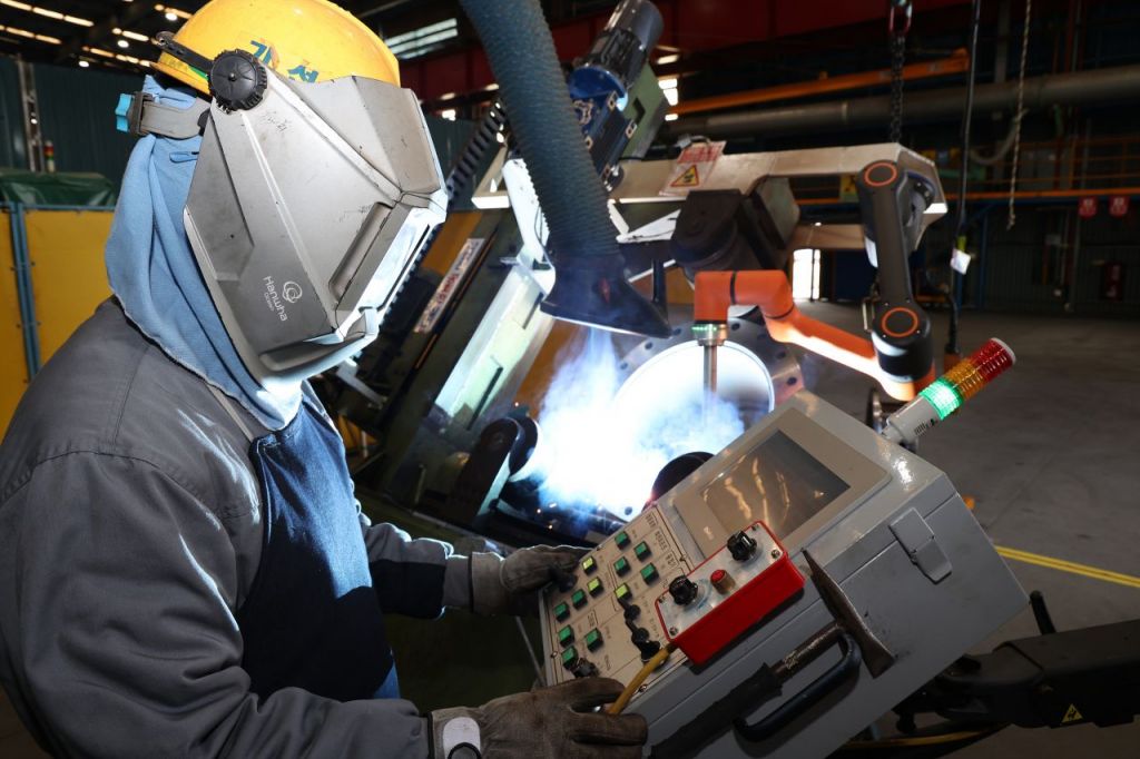 경남 거제시 한화오션 조선소에서 용접공이 배관 용접용 협동로봇을 활용해 작업하고 있다. 한화오션