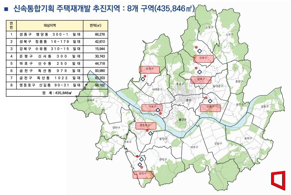신규 지정 대상은 △성동구 행당동 300-1 일대(6만6276㎡) △성북구 정릉동 16-179 일대(4만2810㎡) △강북구 수유동 310-15 일대(1만5944㎡) △은평구 신사2동 300 일대(3만743㎡) △마포구 신수동 250 일대(4만4718㎡) △금천구 독산동 979 일대(9만3990㎡) △금천구 독산동 1022 일대(8만3203㎡) △영등포구 신길동 90-31 일대(5만8162㎡) 총 8개 구역이다.