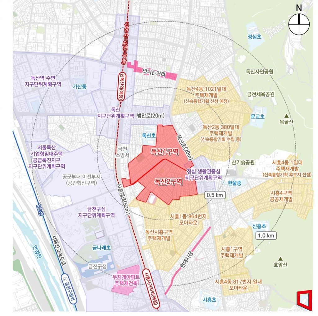 독산1·2구역은 신속합기획을 동시에 추진해 기반시설을 확충했다. 시흥대로와 독산로를 잇는 폭 20m(4차로) 동서도로를 신설해 교통체계를 보완하고, 지역 내 이동편의성을 획기적으로 개선하게 된다.