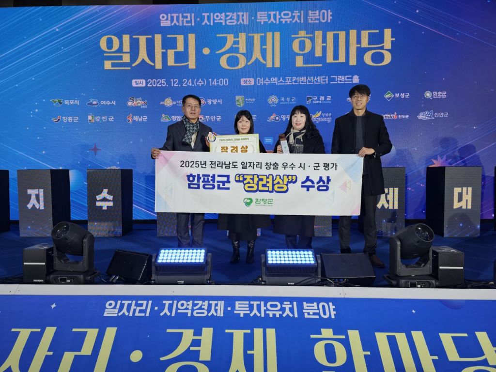 함평군은 여수 엑스포컨벤션센터 그랜드홀에서 열린 '전라남도 일자리·경제 한마당 행사'에서 2025년 일자리 창출 우수 시군 평가 결과 '장려상'을 수상했다고 25일 밝혔다. 이는, 2018년 수상 이후 7년 만의 쾌거이다.