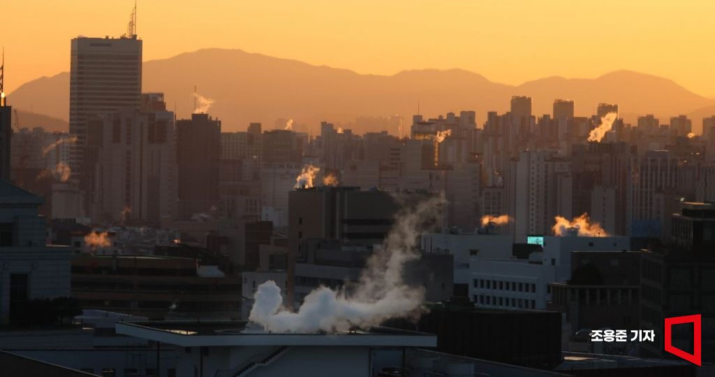 체감온도가 영하 20도까지 떨어지며 올 겨울들어 가장 추운 날씨를 보인 26일 서울 종로 한 건물에서 바라본 도심의 빌딩들이 난방을 가동하며 수증기를 내뿜고 있다.