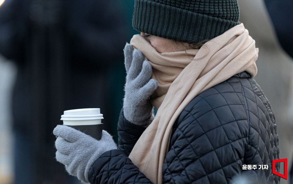 기온이 큰 폭으로 떨어지며 영하권 강추위를 보인 26일 서울 종로구 광화문광장을 지나는 한 외국인이 뜨거운 커피로 몸을 녹이고 있다.