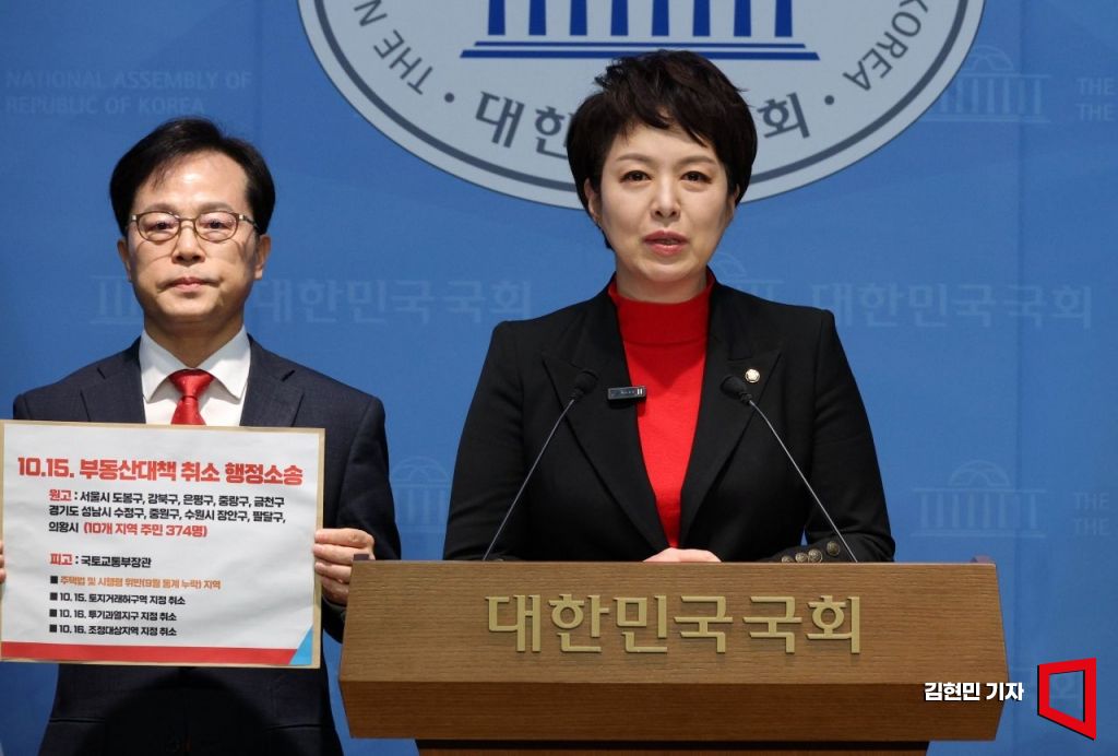 김은혜 국민의힘 원내정책수석부대표는 이날 국회 소통관에서 기자회견을 열고 "투기과열지구 및 조정대상지역을 서울 전역으로 확대한 10·15 부동산 대책 취소를 요구하는 행정소송을 제기한다"고 밝혔다.