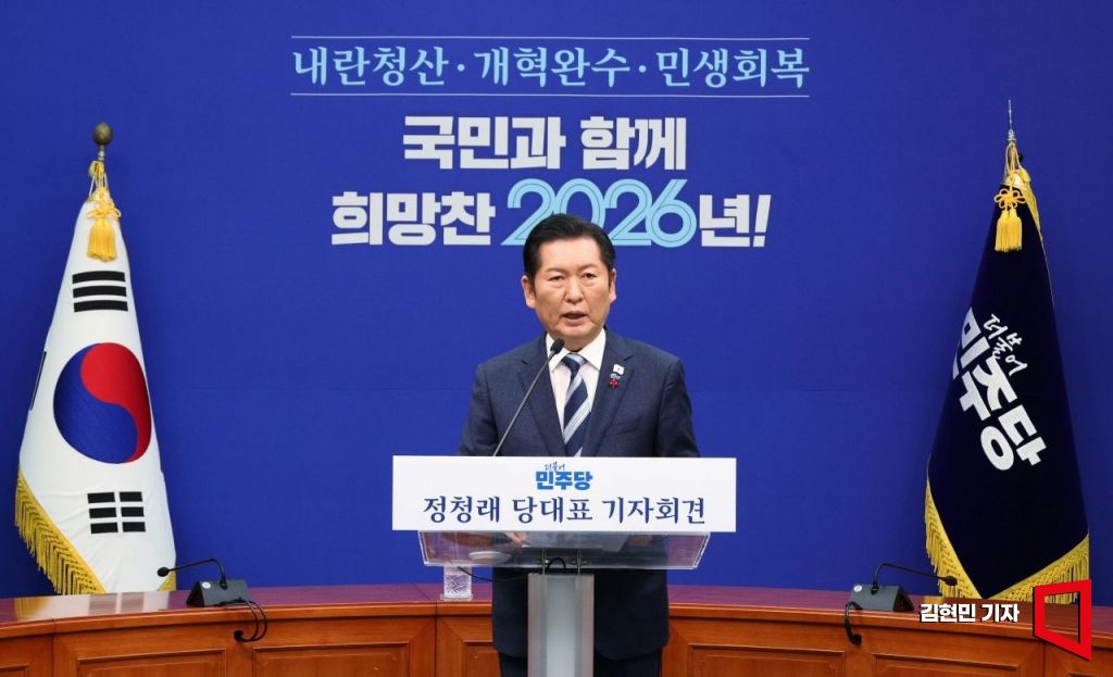 정청래 더불어민주당 대표가 26일 국회에서 기자회견을 하고 있다.