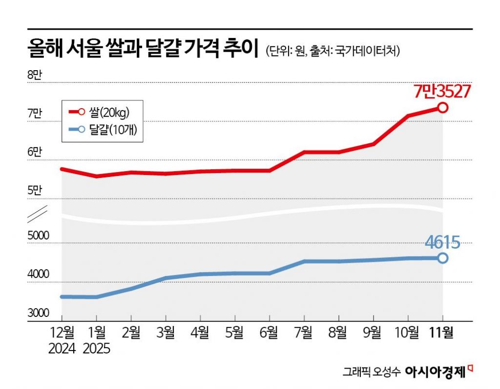 올해 주요 농축산물 가운데 쌀과 달걀 가격이 가장 큰 폭으로 오른 것으로 나타났다. 쌀은 하반기 들어 상승세가 가팔라졌고, 달걀은 연중 내내 높은 가격을 유지하며 좀처럼 내려올 기미를 보이지 않고 있다. 주식과 필수 단백질 가격이 동시에 오르면서 소비자 체감 물가 부담이 커지고 있다는 분석이 나온다.