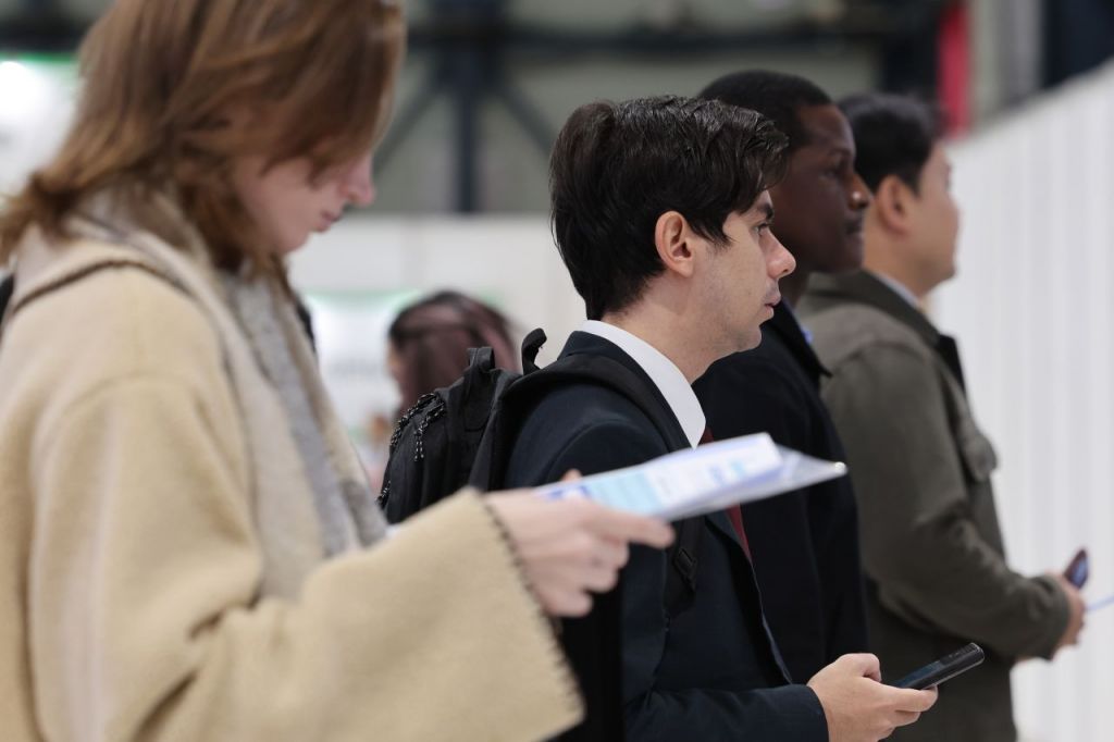 지난달 서울 강남구 SETEC에서 열린 2025 외국인 취업·채용 박람회를 찾은 구직자들이 채용공고 게시대를 살펴보고 있다. 연합뉴스