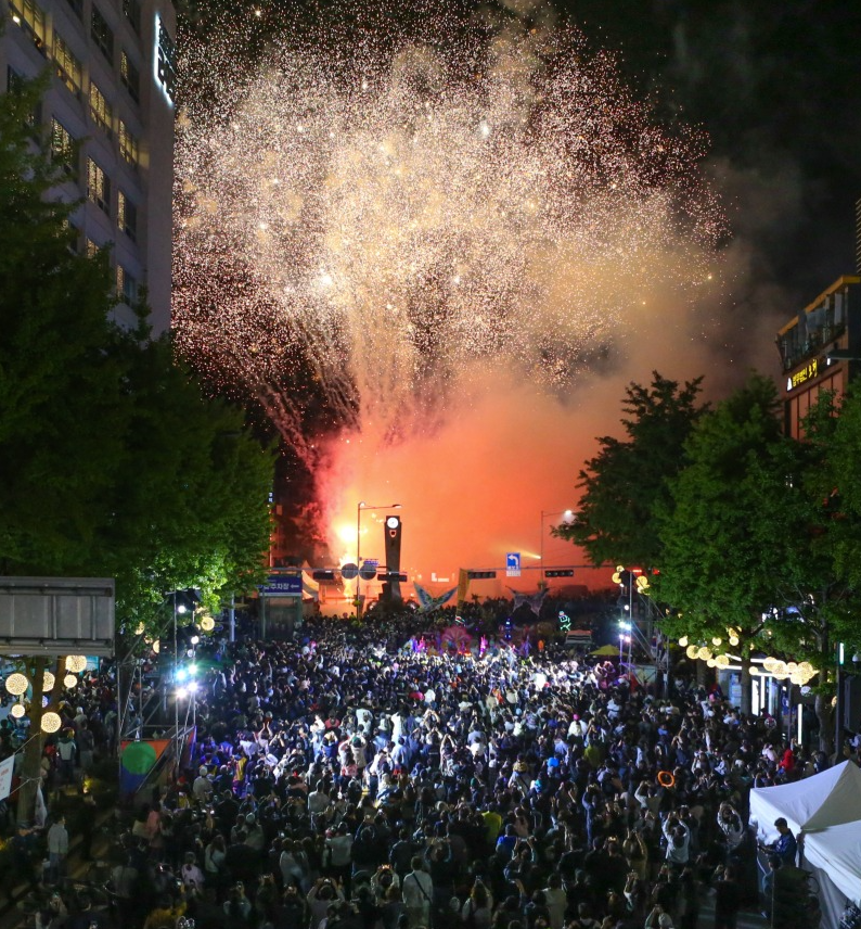 광주 동구 충장로 일대에서 열린 충장축제 현장에서 불꽃놀이와 함께 시민들이 축제를 즐기고 있다. 광주시 제공