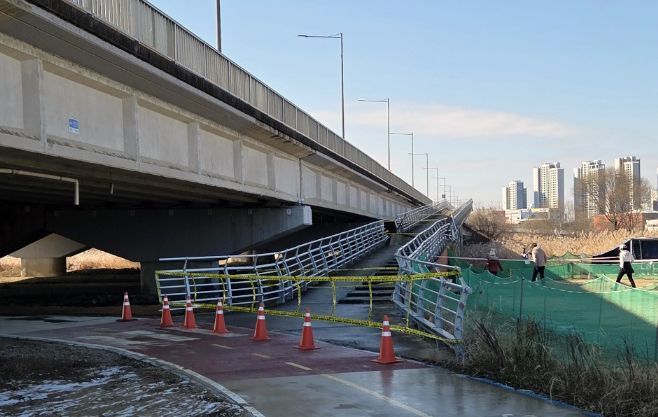 떨어진 연결램프 위에 설치된 철제 난간은 휘어지거나 끊어져 파손됐고, 연결램프를 서로 잇는 보행로의 단면도 드러났다.
