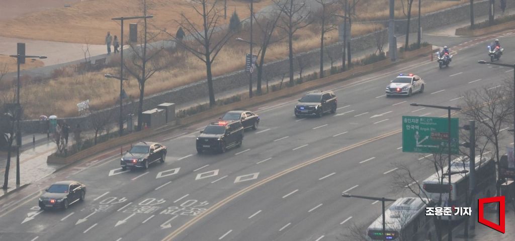 이재명 대통령이 탄 차량 행렬이 29일 오전 서울 경복궁 인근을 지나 청와대로 향하고 있다. 대통령이 청와대로 출근하는 것은 문재인 전 대통령이 마지막으로 출근한 퇴임일인 2022년 5월 9일로부터 3년 7개월만이다.