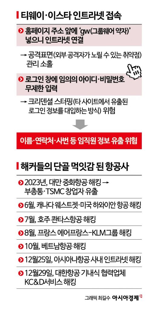 황석진 동국대 국제정보보호대학원 교수는 "아이디와 비밀번호를 여러 사이트에서 동일하게 쓰는 경우가 많기 때문에 보안 수준이 낮은 사이트에서 이미 로그인 정보가 유출된 경우 사내 인트라넷까지 해킹당할 위험이 있다"며 "항공사의 경우 사내 인트라넷에 고객 정보를 비롯한 다양한 데이터가 올라올 수 있어서 해커들이 타깃으로 삼을 가능성이 크다"고 했다.