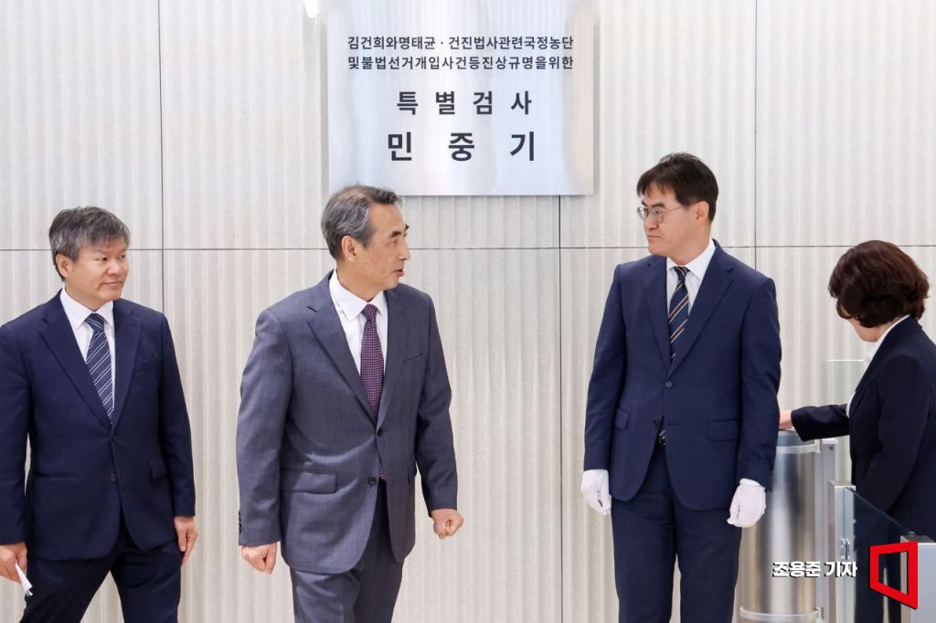 윤석열 전 대통령의 부인 김건희 여사 의혹 관련 사건을 맡은 민중기 특별검사가 2일 서울 종로구 KT광화문빌딩 웨스트에 마련된 특검 사무실에서 열린 현판 제막식을 마치고 이동하고 있다. 2025.7.2 조용준 기자